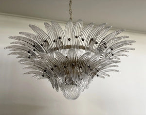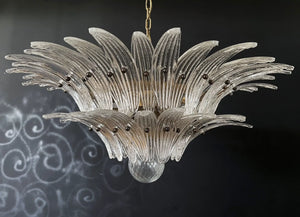 This masterpiece of an Italian chandelier is adorned with 58 Clear Palmette glass pieces. With its 58 hand-blown Murano glass elements, this chandelier will undoubtedly be a focal point in any room it graces. The chandelier is also known by the model name "Palmette" and is a classic and well-known Murano lamp. The frame comes standard in matte gold (as shown in the pictures), but it is also available in shiny gold, silver patinated chrome, and shiny chrome.
