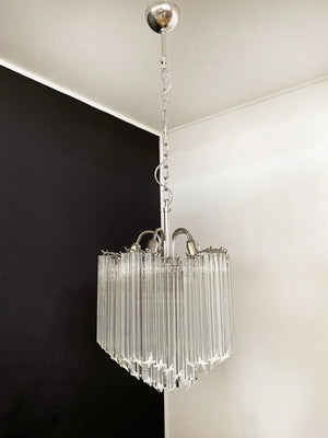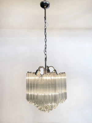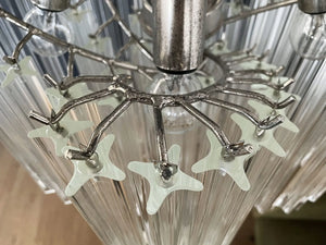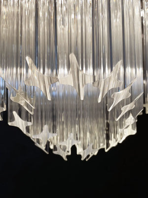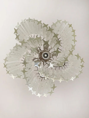 This masterpiece of an Italian chandelier is adorned with 60 Clear Prism glass pieces of the quadriedri type. With its 60 hand-blown Murano glasses, this chandelier is sure to be a stunning focal point in any room it graces. The frame is available in silver patina chrome, satin gold, shiny gold, and shiny chrome.