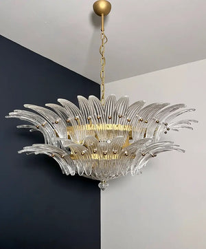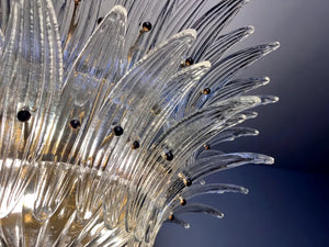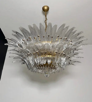 This masterpiece of an Italian chandelier is adorned with 82 Clear Palmette-shaped Murano glass pieces. With its 82 hand-blown glass elements, this chandelier is sure to be a focal point in any room where it is placed. The frame comes standard in matte gold (as shown in the pictures), but is also available in silver patinated chrome, shiny gold, and shiny chrome.