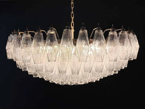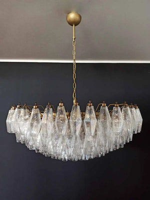 Expertly crafted in the famous glass-making region of Murano, Italy, this chandelier features 185 iridescent glass "poliedri" pieces, providing a stunning and unique lighting experience. Elevate any space with its elegant design and luminous glow.
