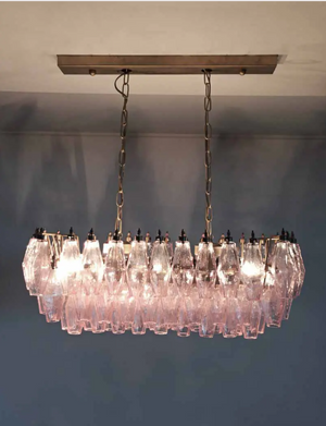 Illuminate your space with the stunning Murano Chandelier. Featuring 84 hand-crafted glass pieces, this Poliedri chandelier adds a touch of elegance to any room. The pink color adds a pop of color while creating a warm and inviting atmosphere. Elevate your decor with this unique and exquisite piece.