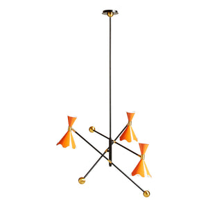 Our Ripple articulating lighting collection features poppy orange shades trimmed with white rippled edges. Blackened steel frames with luxe brass accents are designed with points of rotation and extension for precision control. Chandelier and sconce styles feature rotating shades cinched with a modern brass cuff. Adjustable arms and shades let you direct light wherever you need it. Our floor lamp stem can be adjusted to different heights. Its base features a brass cuff and campaign corners.