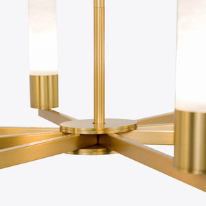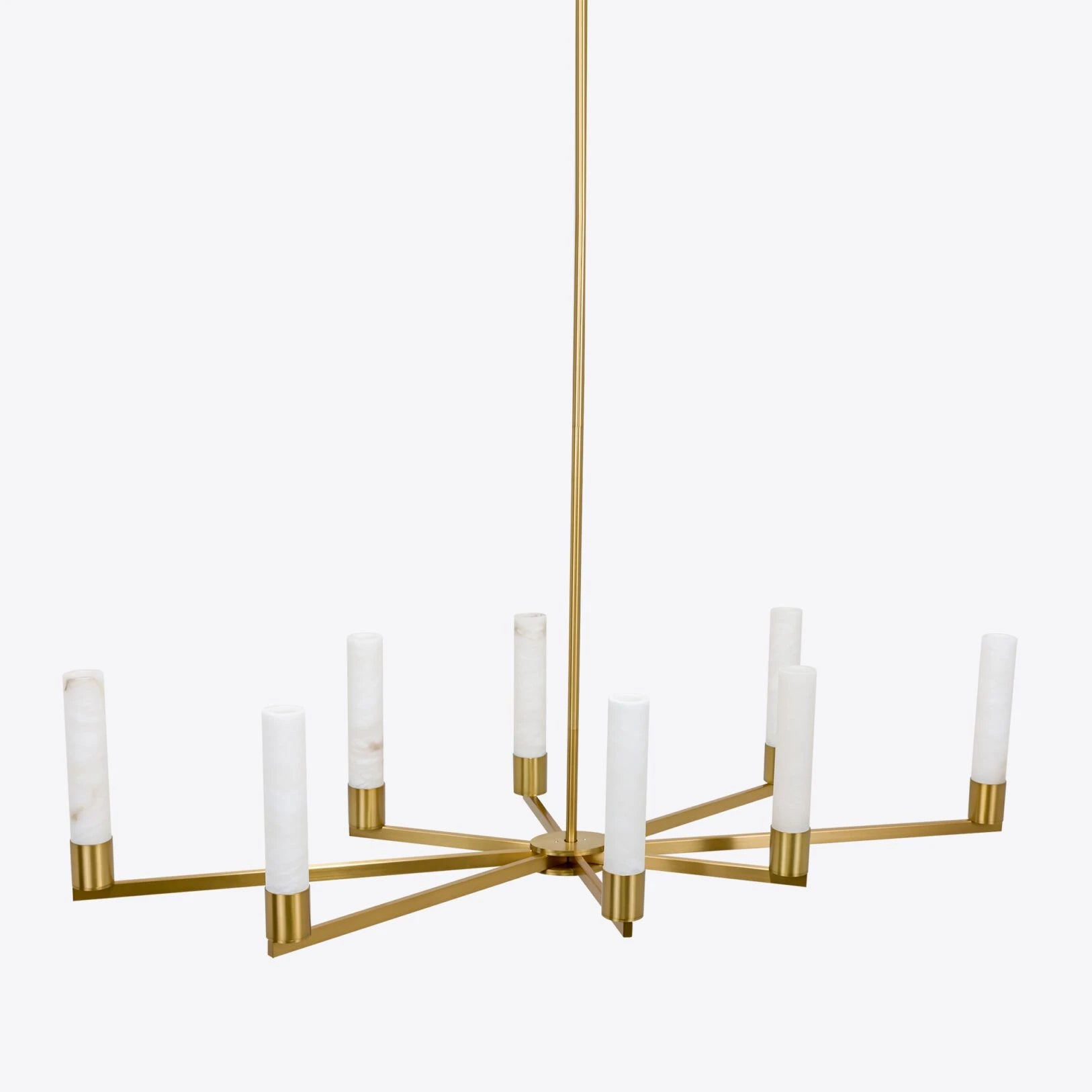 Beautiful statement Spanish Alabaster chandelier. This elegant light features a several alabaster tubes mounted on arms on a brass structure, creating an utterly mesmerising silhouette. This piece boasts an enchanting allure that will bring an industrial lux style to any room in the home.