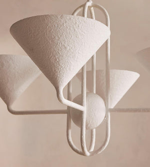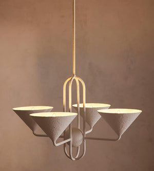 The textural plastered finish is created by adding gradual layers of putty and water-based paint. Designed with an adjustable pole kit to adapt to your living space, it features four upright shades which emit a warm light in any room.