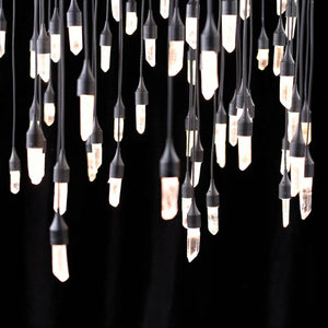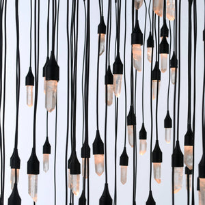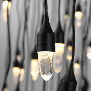Exquisitely handcrafted, the Rock Crystal Rain Pendant consists of delicate rock crystal drops that are lightly polished by hand and secured to individual sockets on the frame so that each crystal can be illuminated. As light passes through the translucent stone, the multi-faceted crystals disperse the light in all directions, casting dramatic shapes and shadows on the wall and radiating a soft, romantic glow. Lightweight in appearance, the Rock Crystal Rain pendant is a spectacular decorative piece.