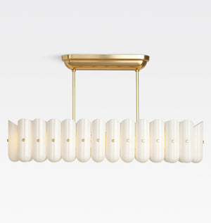 Drawing inspiration from the opulence of Art Deco design, the Lorna Linear Chandelier showcases hand-blown glass shades with signature radial fluting—an architectural detail that softens light and adds sculptural presence.