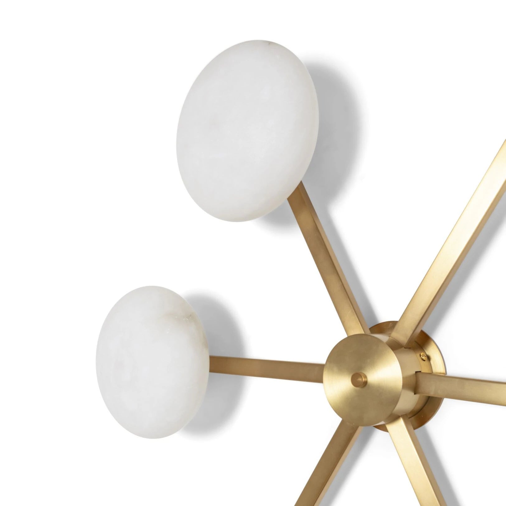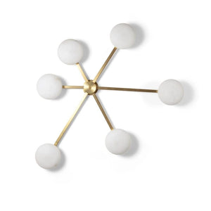 Our new Rossi Sputnik chandelier is based on a 1970s Murano design but modernised using alabaster globes. Available in 2 sizes, the Rossi features alabaster globes on extending brass rods. Great as either a flush mount ceiling light or a feature wall light.
