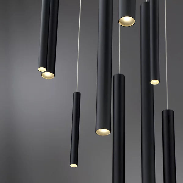 A treat for the eyes. The Santana LED Chandelier from Eurofase creates a concert of line and light that'll prove difficult to look away from. Aside from suspending the design, a circular canopy anchors the piece visually, appearing like a portal for the cascading tubes. Adjustable individually, extruded metal tubes create an encompassing composition; they present stunning visuals when directly underneath it or when seen from across the room. LEDs at the end of the tubes work in conjunction to produce a spirited down glow.