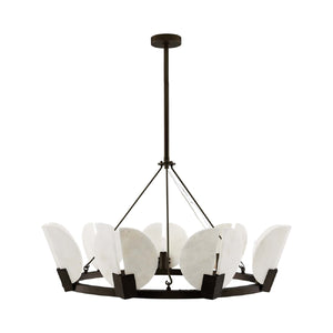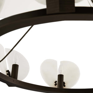 The Sierra Chandelier from Arteriors explores the various iterations of Art Deco with an inspired silhouette and bold personality. Embrace this fixture that features demilune-shaped white alabaster half-moon shapes anchored to an English bronze finish frame. Industrial influence sneaks in with a tri—part suspension feeding to a classic down rod.