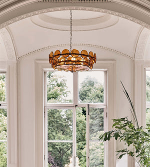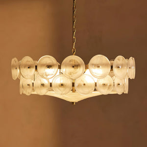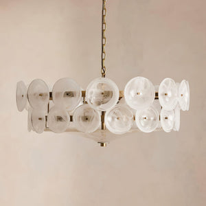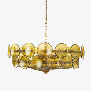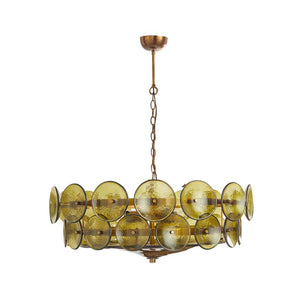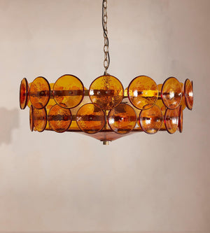 The Solaris Disc Chandelier is a stunning fusion of vintage charm and contemporary design. Featuring a circular arrangement of textured amber glass discs that resemble the sun's radiant glow, this chandelier creates an eye-catching centerpiece. The warm, golden tones and intricate textures offer a soft, diffused light, perfect for creating an inviting atmosphere in any room. Ideal for adding a touch of retro glamour, the Solaris Disc Chandelier suits both modern and classic interiors with its unique and versatile style.