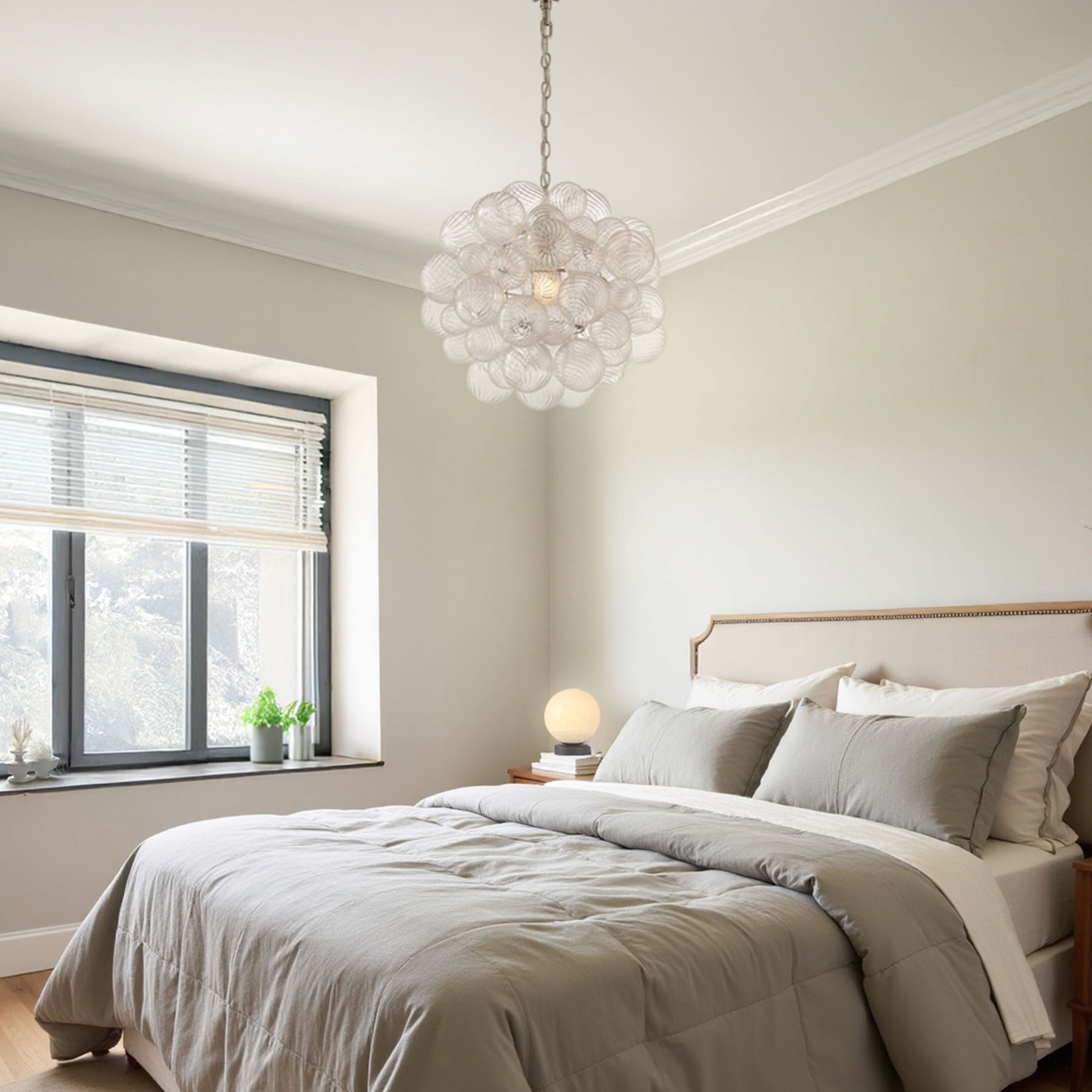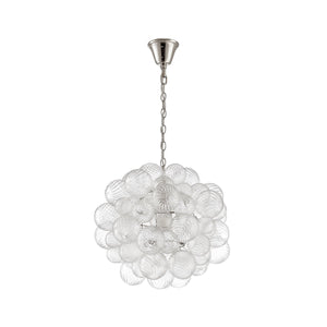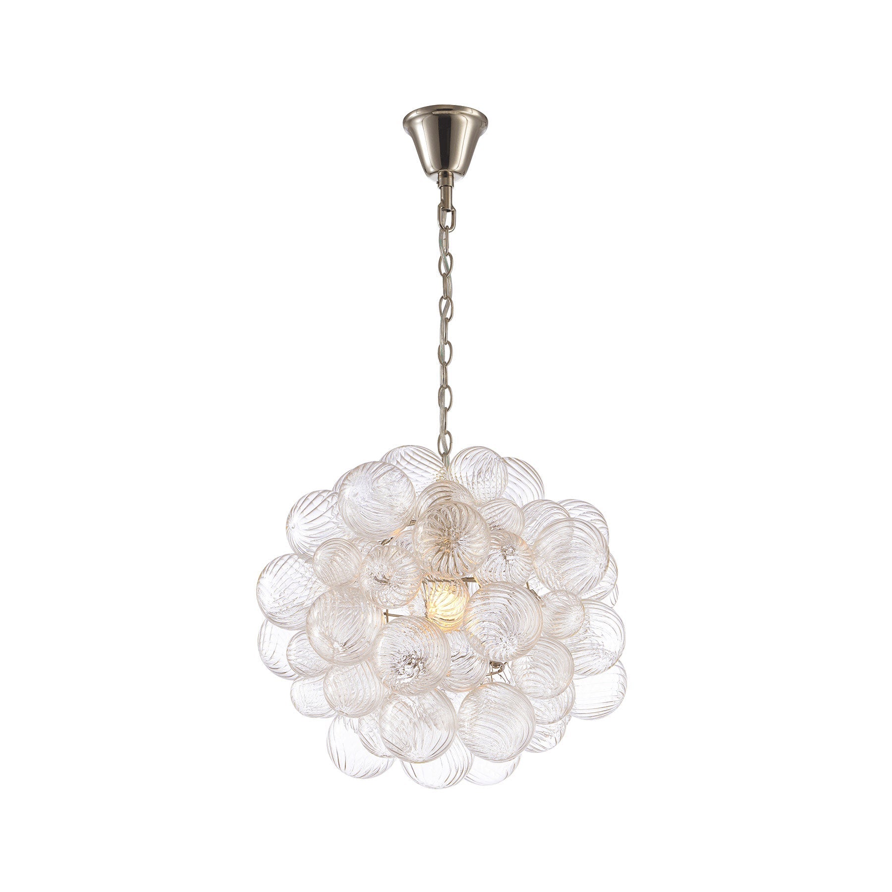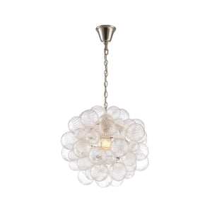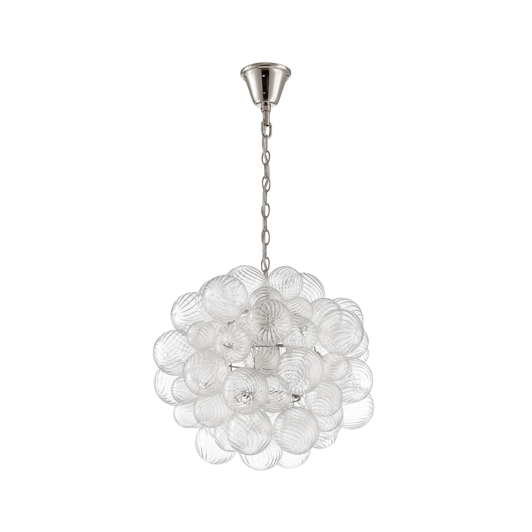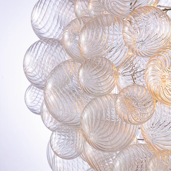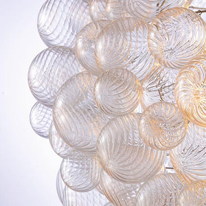 The Spiral Bubble Pendant distills the drama of the larger chandelier into a single luminous form. Dozens of hand-blown glass spheres—each one marked with delicate spiral textures—gather into a petite sculptural cluster, suspended like a floating orb of brilliance.