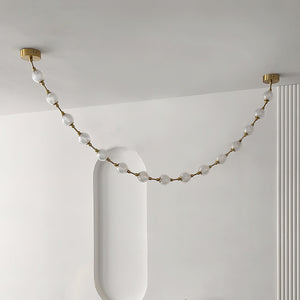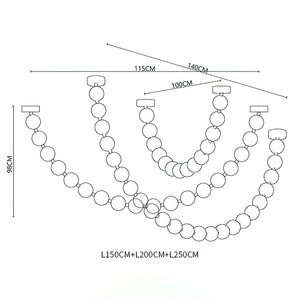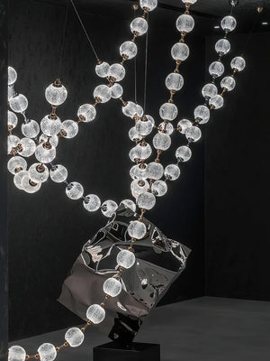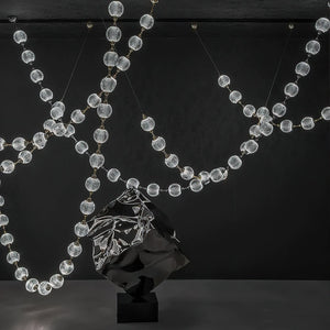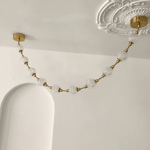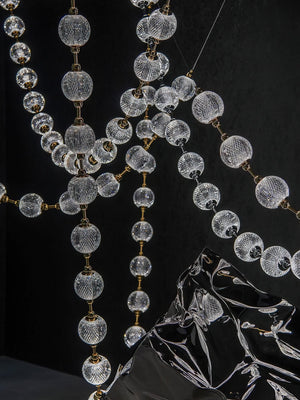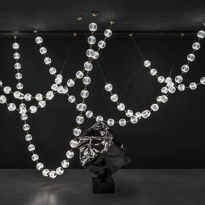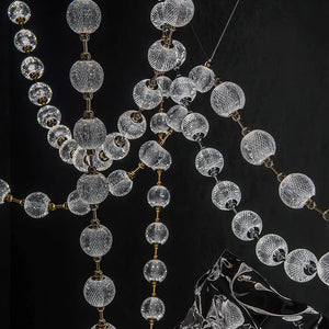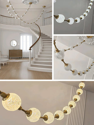 The Celestial Necklace Acrylic Chandelier by Vakkerlight brings the elegance of fine jewelry into the world of lighting design. Inspired by the graceful drape of a luxurious necklace, this chandelier features cascading strands of textured acrylic spheres, delicately connected by golden metal links. The semi-transparent acrylic globes emit a radiant, diffused glow, creating a striking visual effect while remaining lightweight and versatile. Ideal for dining areas, stairwells, or high-ceiling spaces, this piece combines the glamour of a statement necklace with the function of modern illumination — a perfect blend of art, light, and elegance.