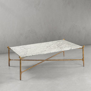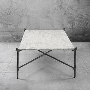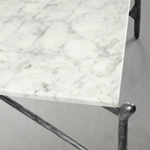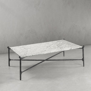 Our collection by the rustic sensibility of hand-forged metal with cool Italian marble. Employing an ancient fabrication process, artisans hand hammer the metal bars to reveal an alive, imperfect and organic texture. The pounded, tapered silhouettes are a rich counterpoint to the smooth, honed stone.