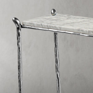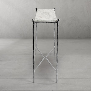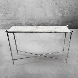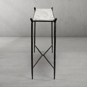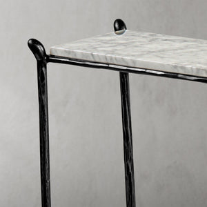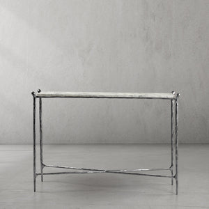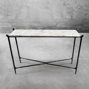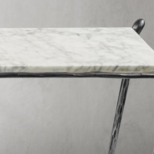 Our collection by the rustic sensibility of hand-forged metal with cool Italian marble. Employing an ancient fabrication process, artisans hand hammer the metal bars to reveal an alive, imperfect and organic texture. The pounded, tapered silhouettes are a rich counterpoint to the smooth, honed stone.
