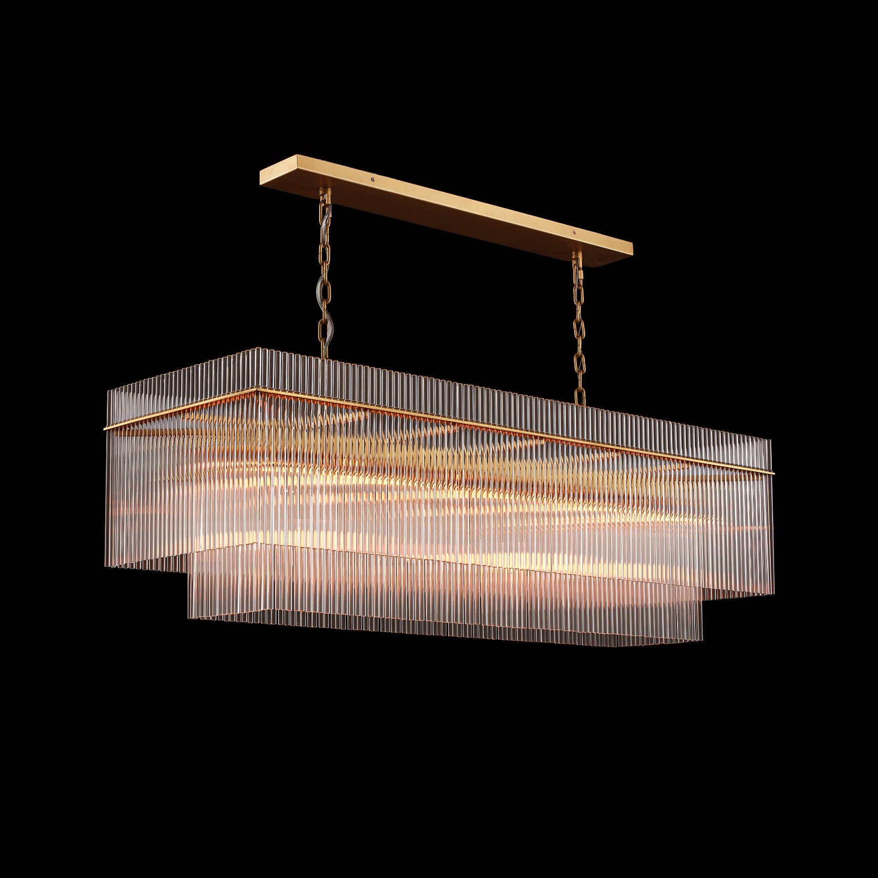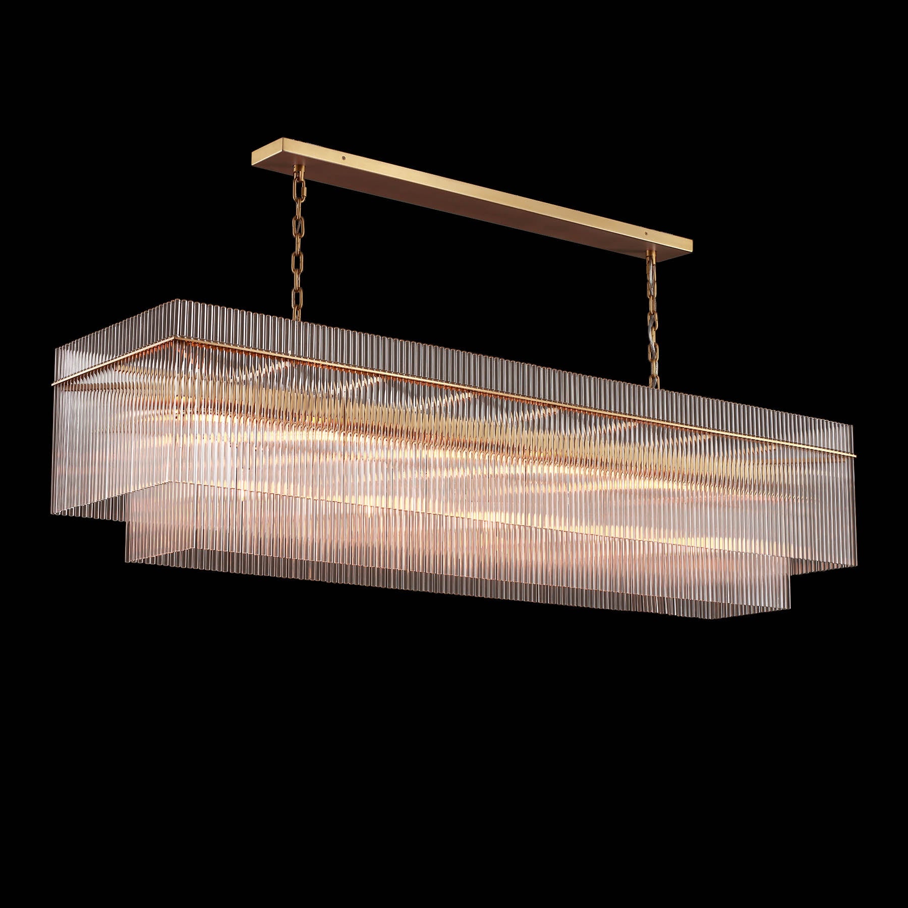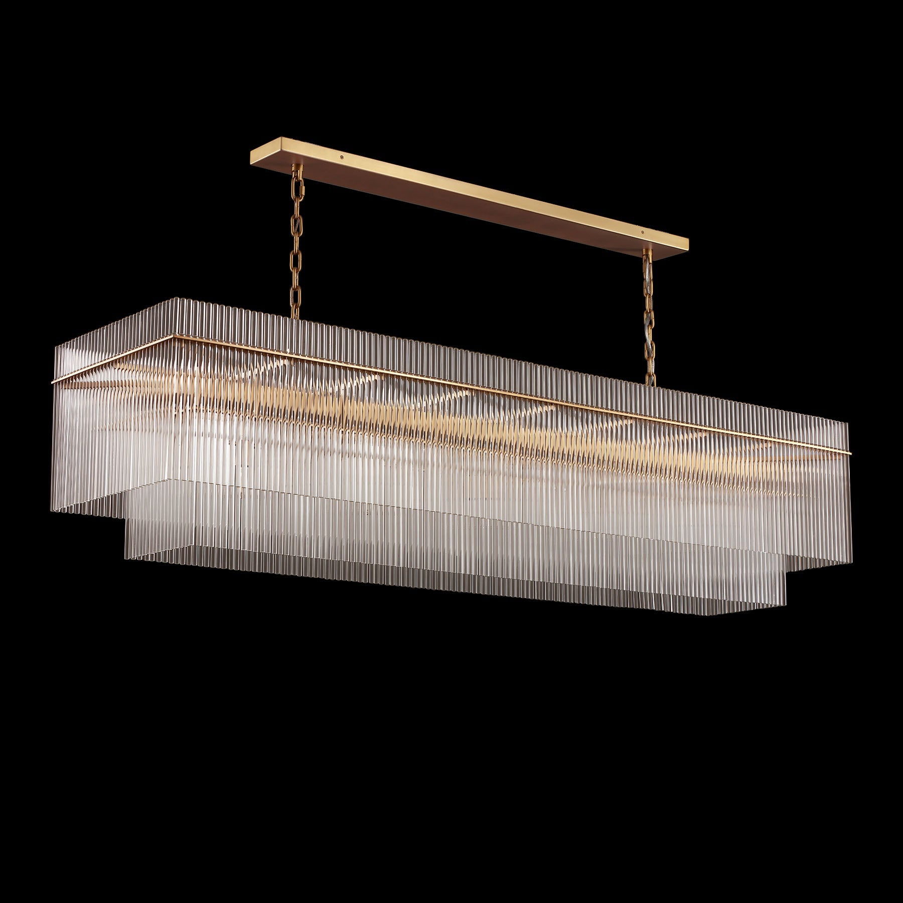 A study in line, proportion, and rhythm. The Timelore Rectangular Chandelier reinterprets the series’ tiered glass-rod language as a panoramic, rectilinear composition. Vertically aligned rods are stepped in long terraces, forming a quiet cascade that reads like a luminous proscenium—precise at the edges, fluid through the center. Suspended from a warm brass-toned bar with slender cables, the silhouette appears to float, balancing architectural rigor with an inviting glow.