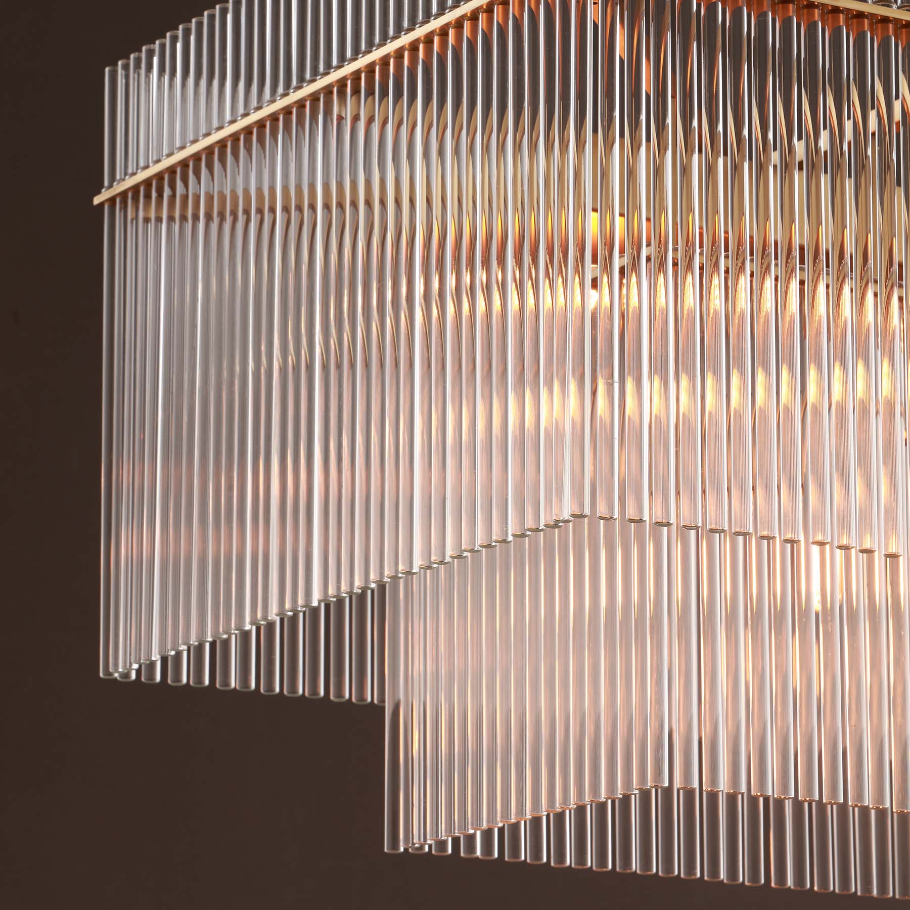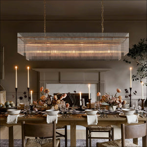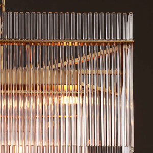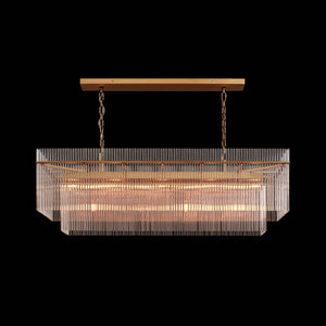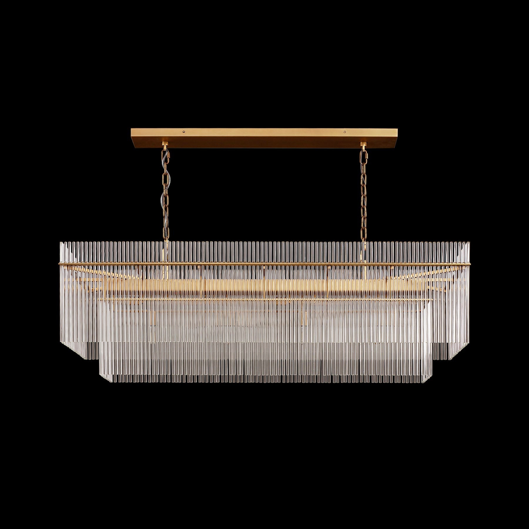 A study in line, proportion, and rhythm. The Timelore Rectangular Chandelier reinterprets the series’ tiered glass-rod language as a panoramic, rectilinear composition. Vertically aligned rods are stepped in long terraces, forming a quiet cascade that reads like a luminous proscenium—precise at the edges, fluid through the center. Suspended from a warm brass-toned bar with slender cables, the silhouette appears to float, balancing architectural rigor with an inviting glow.