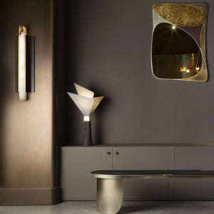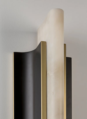 At the heart of the Timide Sconce lies a cylinder of honed natural alabaster, a material cherished since antiquity for its captivating luminosity. Each piece is singular, with soft, organic veining—nature's own artwork—that promises no two sconces are exactly alike.