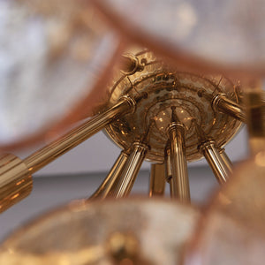 Illuminate your space with the Uroko Large Chandelier, inspired by the delicate pattern of fish scales. Expertly crafted glass discs diffuse light softly, producing a warm and inviting ambiance. The glossy warm brass finish complements the shimmering glass, making this chandelier a sophisticated centerpiece that enhances any room with subtle elegance and expert design.