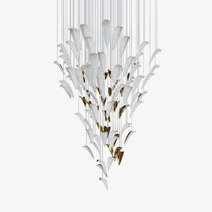 The White Feather Art Deco Chandelier by Oasislives brings elegance in motion with its cascading arrangement of wing-like glass elements in soft white and glistening gold. Suspended in a graceful inverted cone form, each piece mimics the delicate curve of a feather, creating a dynamic yet serene visual impact. Perfect for interiors seeking a touch of sophisticated artistry.