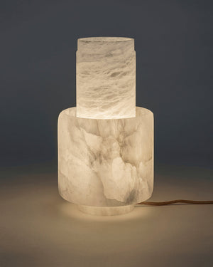 A laud to the beauty of natural stone, its features a pillar of natural alabaster rises in stacked sections to form a uniform base and shade.